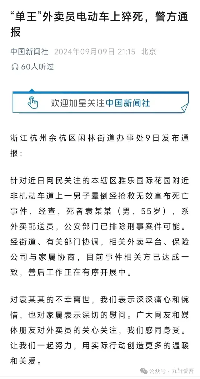 9月5日晚,杭州余杭区一位55岁的外卖员在送完一单后躺在电瓶车上休息,没想到一睡不起,直到凌晨1点被同行发现叫不醒,原来已经去世很久了!