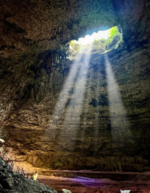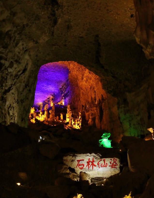 继续往里面走,看到两个令人叹为观止的溶洞景观——泻玉流光和石林仙姿。泻玉流光中,日光直射洞中,像瀑布一样倾泻而下,形成了一道道璀璨的光柱;