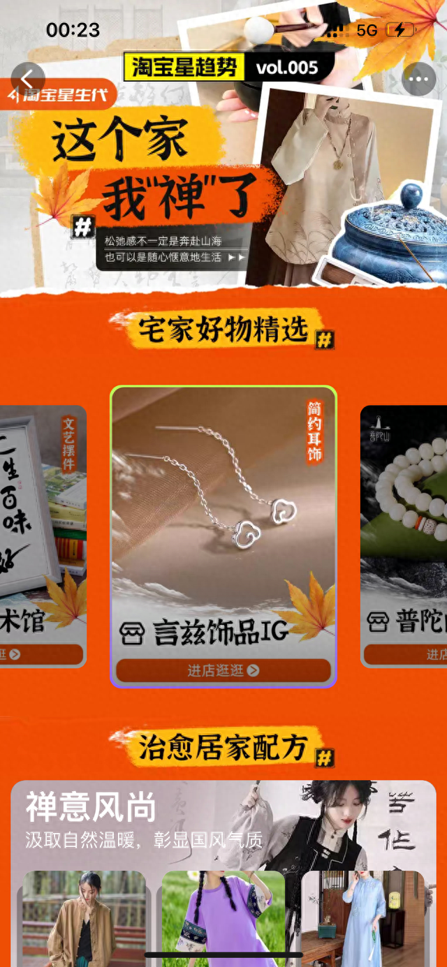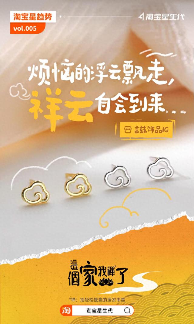 同时,淘宝星生代百万新商造星计划还洞察到各类经济趋势增长及社会热点,为“言兹饰品IG”这类特色品类中小商家进行店铺精准曝光,在淘宝上线了“这个家,我‘禅’了”活动会场,店铺中物美价廉的首饰为18到25周岁年龄段年轻人提供不同选择。用户打开淘宝,进入淘宝星生代百万新商造星计划“这个家,我‘禅’了”活动页面,可以看到“言兹饰品IG”的耳钉。