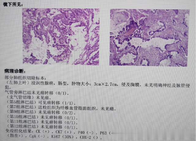 术后病检提示:浸润性腺癌,有胸膜侵犯,5组淋巴结有转移。术后临床分期ⅢA期。依据最新的中国肺癌诊疗指南,ⅠB期有高危因素或ⅡA期以上的肺癌患者,术后建议辅助治疗,防止复发。后电话通知患者家属病人病检情况,建议病人于术后4-6周行辅助治疗。病人行基因检测提示有人类表皮生长因子(EGFR)突变,可以使用靶向药物治疗。后于肿瘤科行化疗+靶向药物的辅助治疗,目前恢复好,复查未见复发迹象。