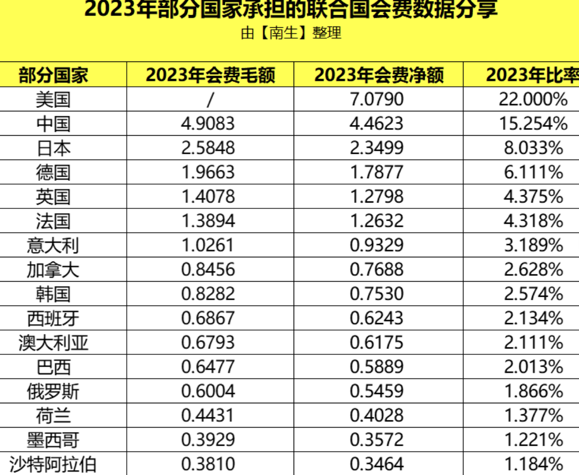 例如,非洲国家爱冈比亚其24年需缴纳的会费仅为30000+美元,乍得缴纳的会费也仅有90000+美元。反之,如美国其所需要缴纳的会费近7亿美元,占联合国会费的比例达到22%。而中国同样需缴纳比例同样占到了约15%。