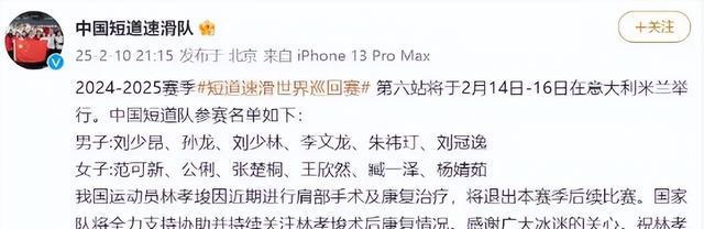 期待短道队名单再现林孝埈,但本月十号,他宣布退出本赛季余赛。同日夜间,我国短道速滑队证实此消息,并公布了参赛选手名单。