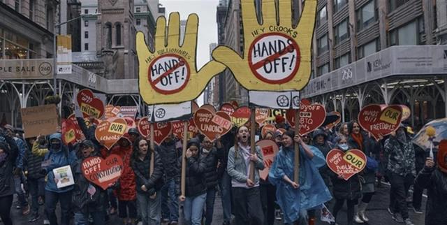 在短短数日内,超过50万人涌入华盛顿,街道上人潮涌动,宛如一片黑色的海洋,绵延不绝。示威者们手持各种标语牌,上面写着“关税让生活难以为继”“别再增税,还我饭碗”等抗议口号。
