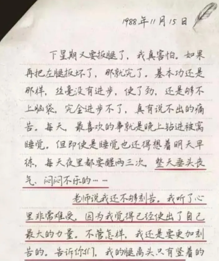 万事开头难,练习压腿等基本功的时候,袁泉身上伤痛不断,甚至有的时候压腿受伤,腿乌青一大片,要强的她也不哭不闹,只在日记中写下心中的害怕。