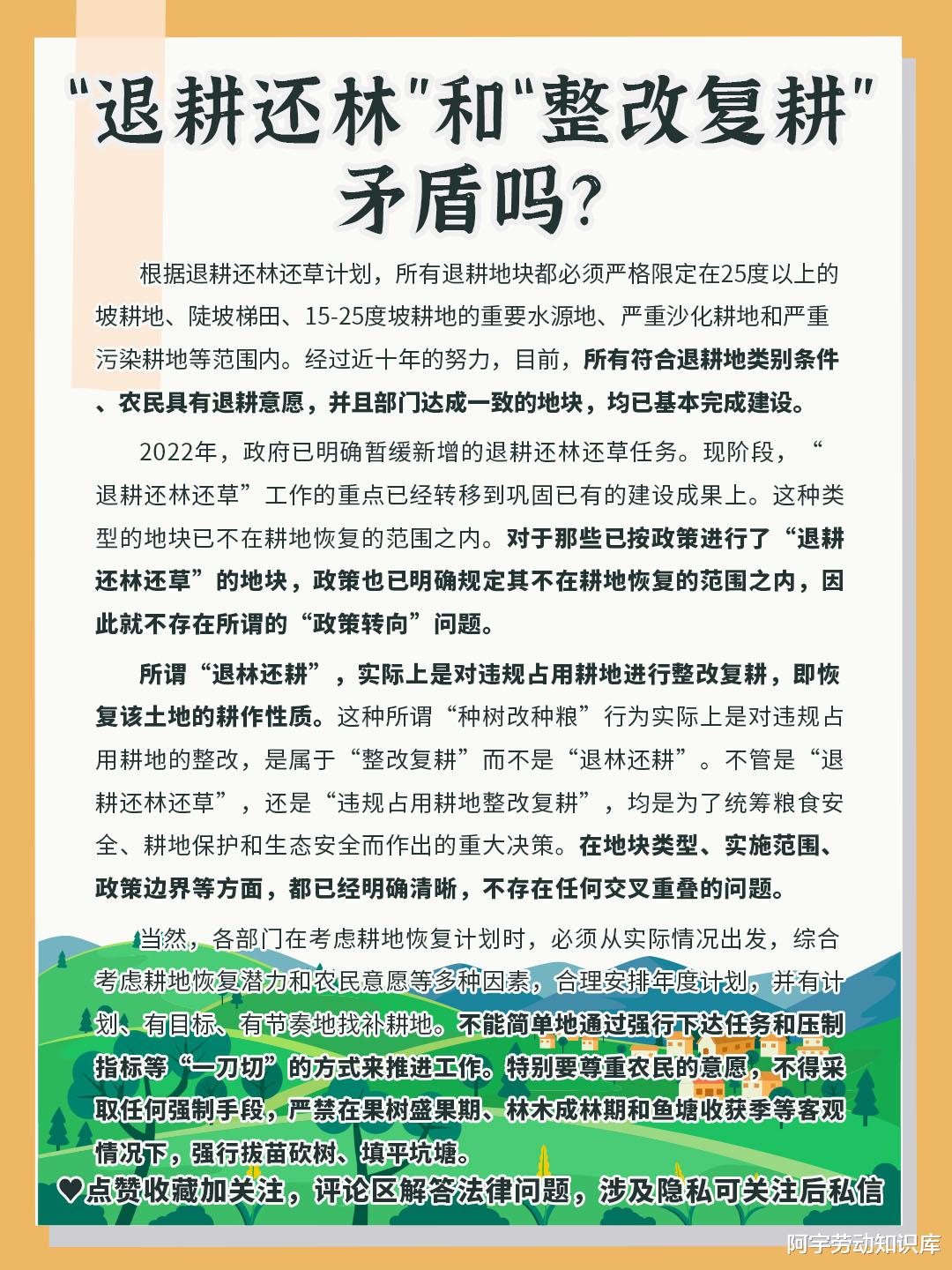 2022年,政府已明确暂缓新增的退耕还林还草任务。现阶段,“退耕还林还草”工作的重点已经转移到巩固已有的建设成果上。这种类型的地块已不在耕地恢复的范围之内。对于那些已按政策进行了“退耕还林还草”的地块,政策也已明确规定其不在耕地恢复的范围之内,因此就不存在所谓的“政策转向”问题。所谓“退林还耕”,实际上是对违规占用耕地进行整改复耕,即恢复该土地的耕作性质。这种所谓“种树改种粮”行为实际上是对违规占用耕地的整改,是属于“整改复耕”而不是“退林还耕”。不管是“退耕还林还草”,还是“违规占用耕地整改复耕”,均是为了统筹粮食安全、耕地保护和生态安全而作出的重大决策。在地块类型、实施范围、政策边界等方面,都已经明确清晰,不存在任何交叉重叠的问题。当然,各部门在考虑耕地恢复计划时,必须从实际情况出发,综合考虑耕地恢复潜力和农民意愿等多种因素,合理安排年度计划,并有计划、有目标、有节奏地找补耕地。不能简单地通过强行下达任务和压制指标等“一刀切”的方式来推进工作。特别要尊重农民的意愿,不得采取任何强制手段,严禁在果树盛果期、林木成林期和鱼塘收获季等客观情况下,强行拔苗砍树、填平坑塘。