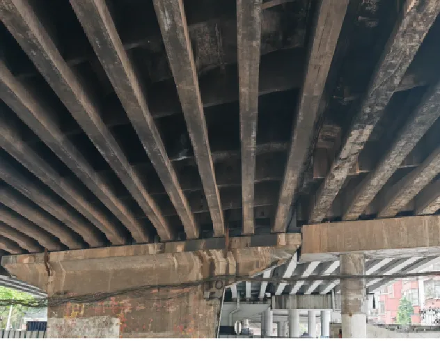 德坭立交桥是广州市中心城区的重要交通枢纽之一,至今已服役 61 年。该桥目前为三幅桥结构,其中中幅是旧桥,于 1964 年竣工;两侧为新桥,竣工时间为 1995 年。多年来,由于长期承受大量车流,桥面和桥体受损明显,曾在 2006 年、2012 年、2014 年进行过修复。