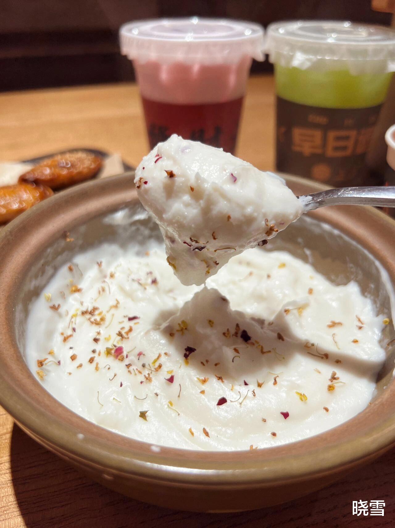 这道甜品是餐厅的另一大特色。新鲜的桂花花瓣撒在绵密的鲜奶米哺上,再淋上一层甜蜜的蜂蜜,口感丰富,层次分明。米哺的口感黏糊糊的,仿佛是小时候妈妈做的米糊,让人回味无穷。桂花的香气与蜂蜜的甜味相互交融,让人陶醉其中。在品尝过前面的重口味菜品后,这道甜品的清爽口感可以完美地中和油腻感,让人瞬间找回味蕾的清新。每一口都充满了细腻的口感和浓郁的香气,仿佛在品尝一件艺术品。如果你喜欢甜品,这道桂花蜂蜜鲜奶米哺绝对不容错过。