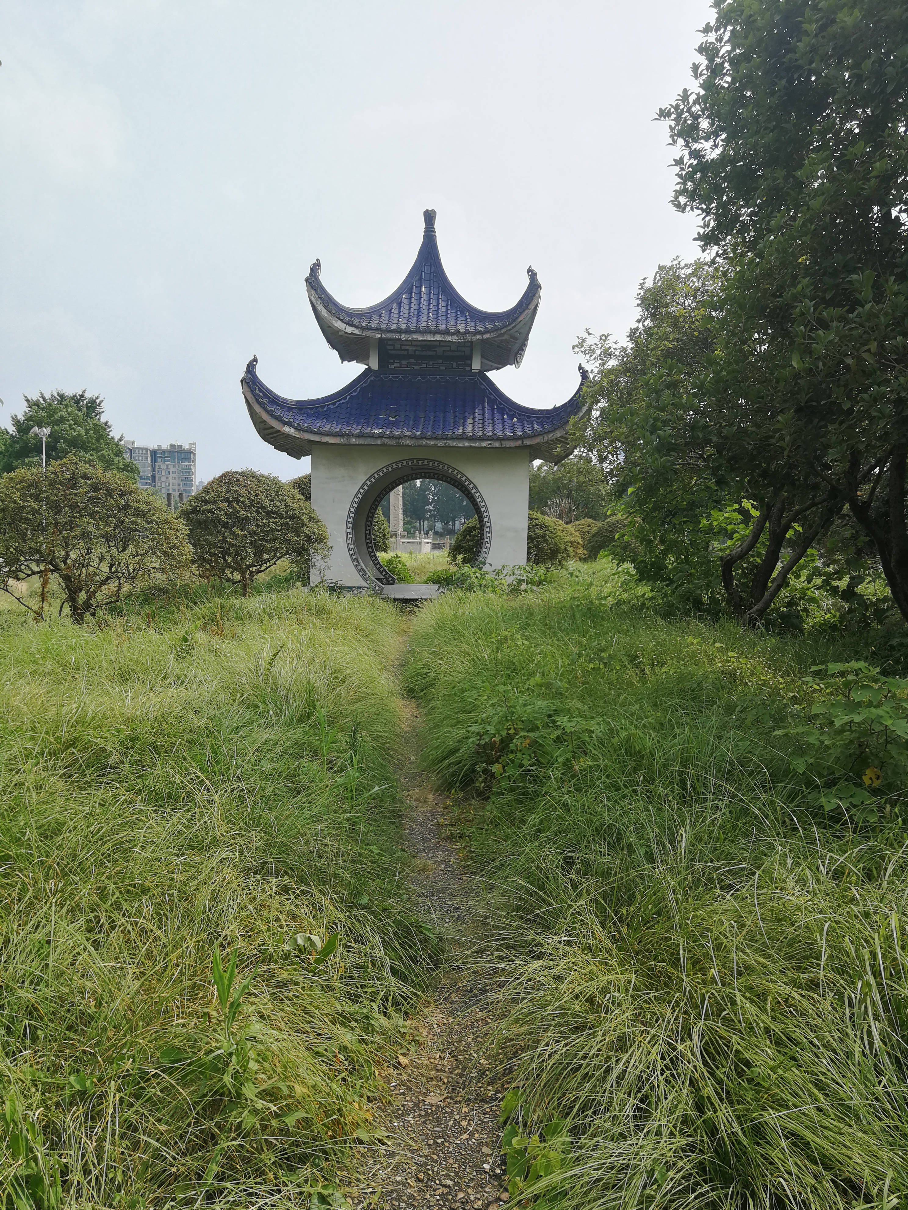 亭子上面的蓝色,在翠绿的植被中显得格外显眼。