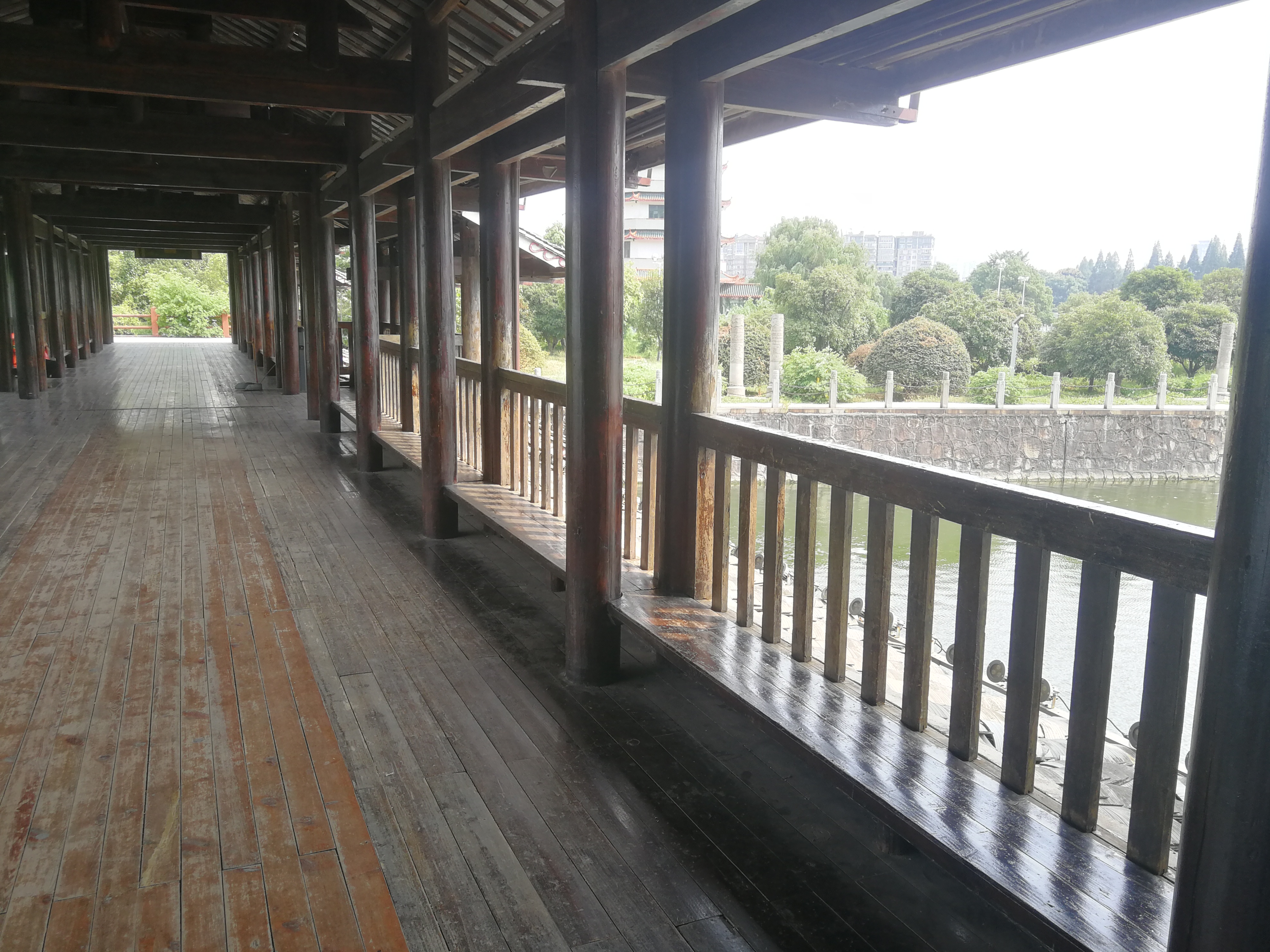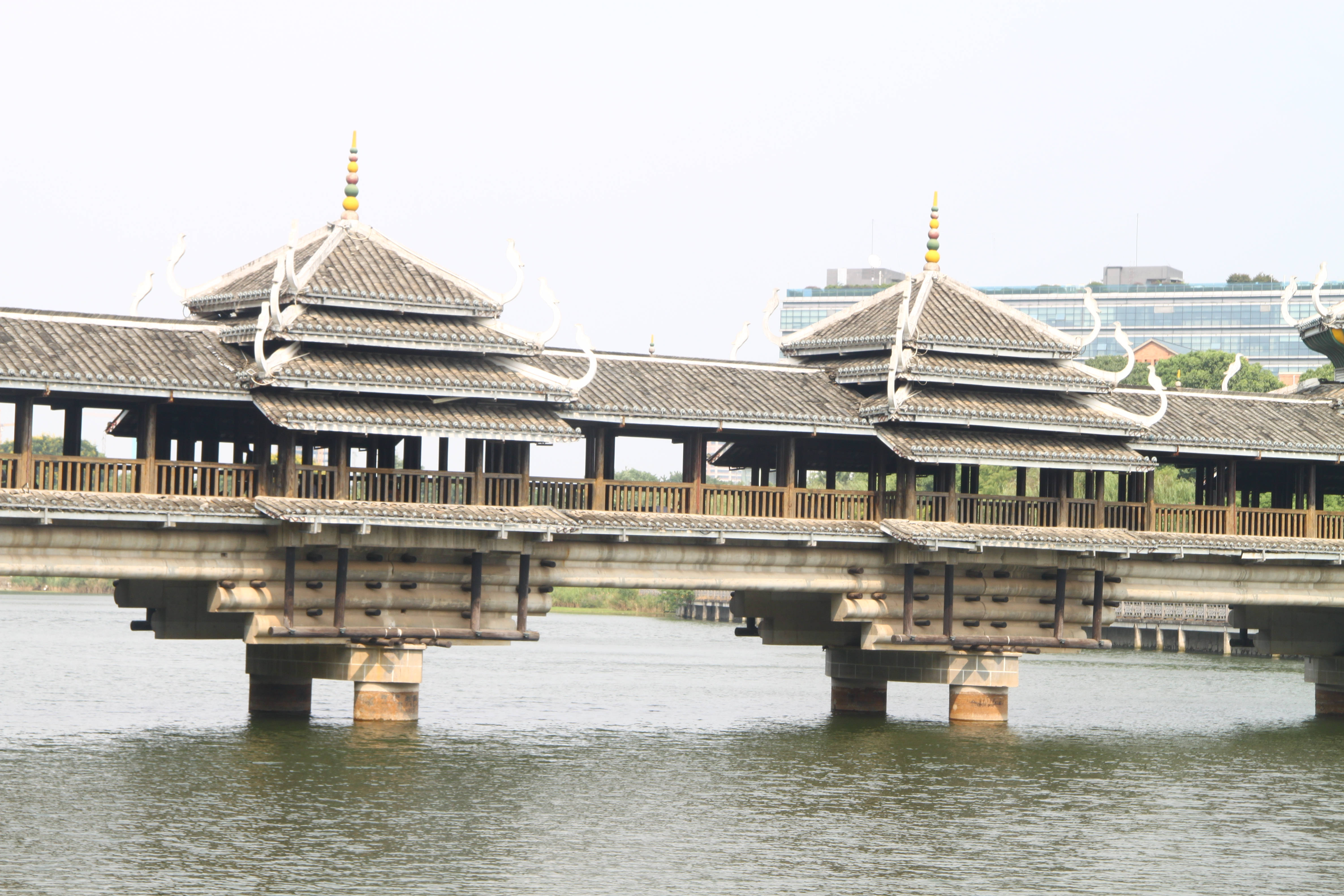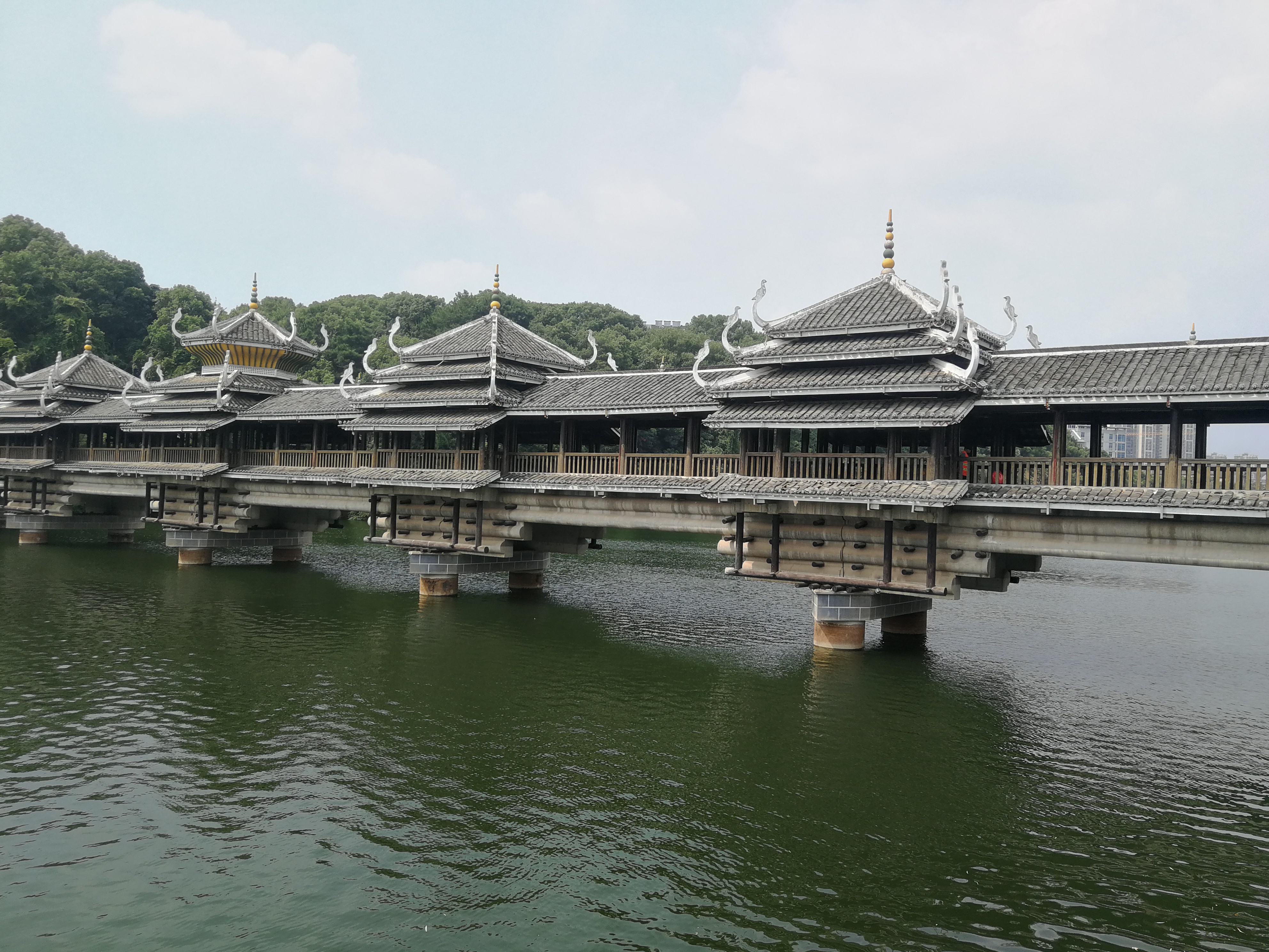 虽然阳光很炙热,不过树荫下、长廊里都能够很好地缓解温度的不适。和周边的现代建筑相比,这座桥梁带来的视觉冲击很强烈,免不了有一种想一睹为快的感觉。你看与不看,它都在那里亭亭玉立着。风雨桥的整体设计简洁明快,工艺看上去精雕细琢。飞翘的檐角,顶上有宝葫芦装饰。桥上很多人影晃动着。看得出很多本土居民会来此散步、休闲锻炼。