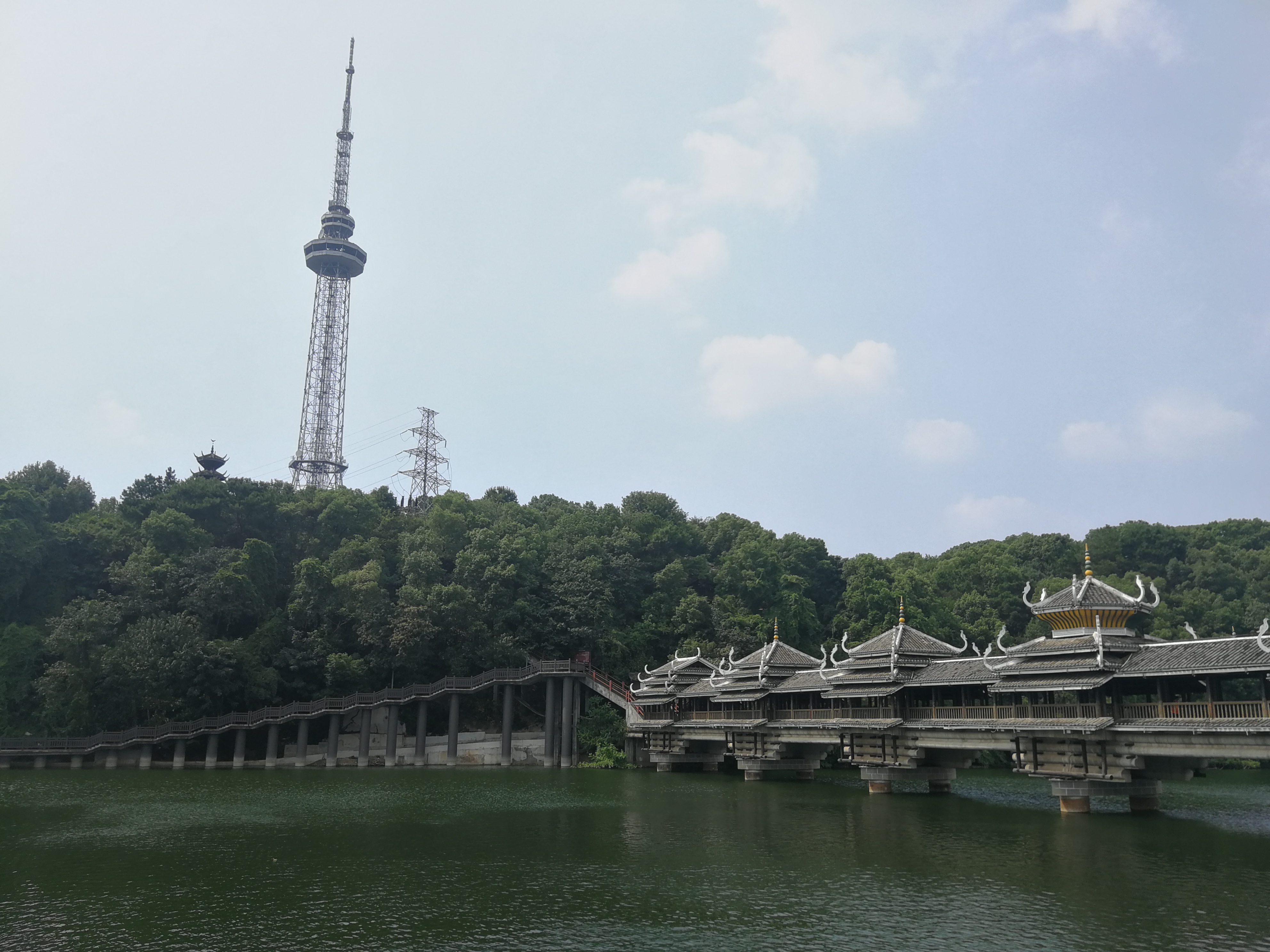 凭栏四下张望,清澈的湖水,平静的湖面,是个不错的休闲场所。整个桥身全长将近150米。水体看起来保护得不错。这种木石结构的桥梁,承载了传统历史文化、地域民俗文化及少数民族侗族文化融合。走完了整座桥梁,从这个方向看过去,加上了潇湘阁的高塔,整个画面显得更加饱满。盛大的节日时,主管部门还会组织载歌载舞以及祭拜仪式,来弘扬民俗文化。侧边的线条很简洁。到了对岸,从水边的悬梯走到公园的其它景点。每一根柱子仿佛是金箍棒,可大可小,可粗可细。