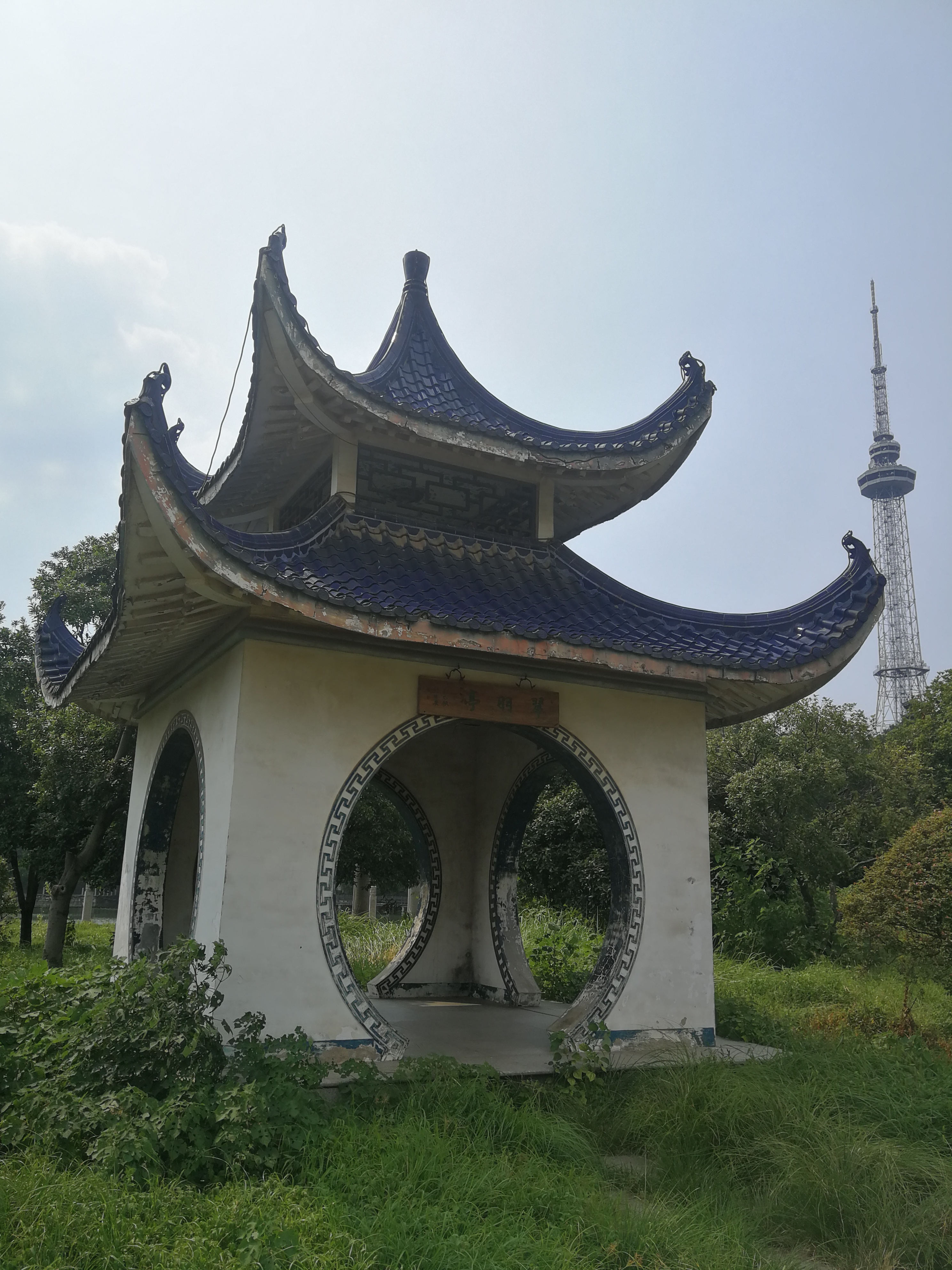 出了宝塔,来到了下面的亭子。亭子上面的蓝色,在翠绿的植被中显得格外显眼。整个亭子四面镂空,全是圆拱门。还有一个好听的名字---翠羽亭。小心翼翼地从杂草丛生的通道来到凉亭。植被好,又靠近水源地,老是担心会不会窜出一条花斑大蛇来。这是翠羽亭,和它俏丽的外表一样,名字也很动听,让你听过很难忘怀。