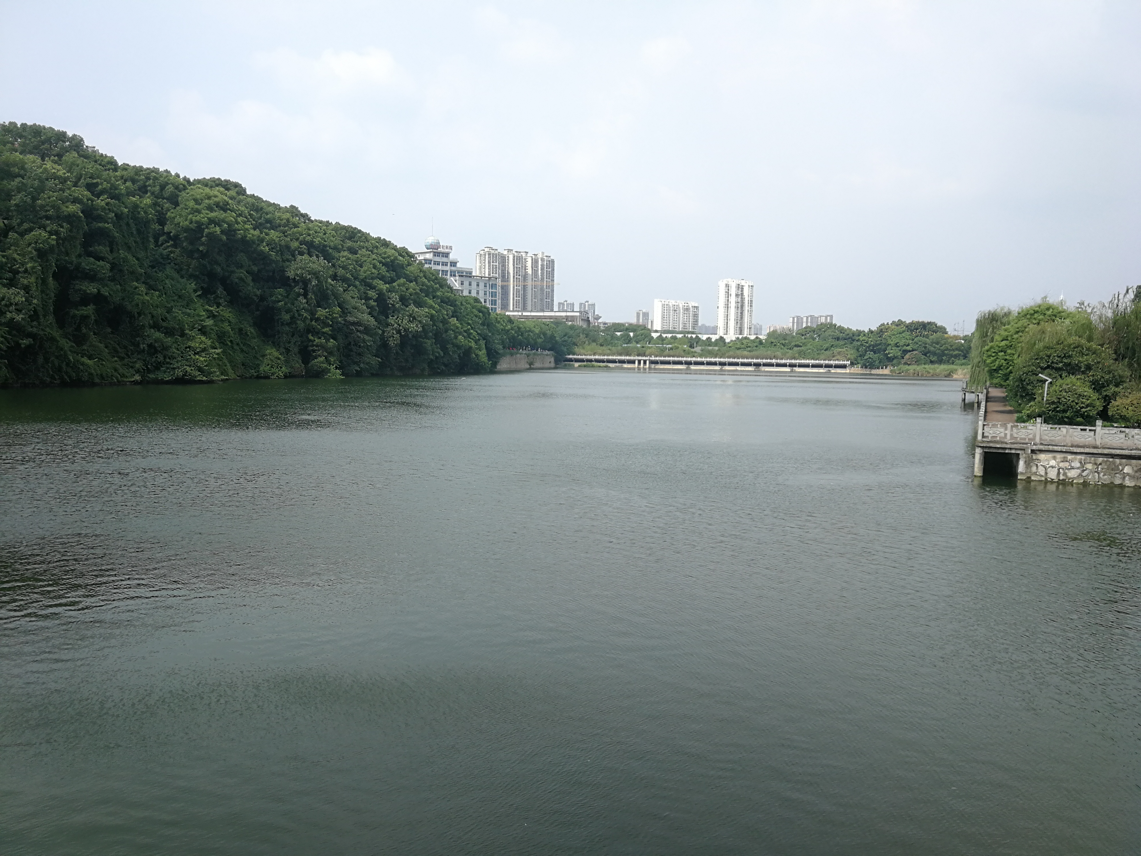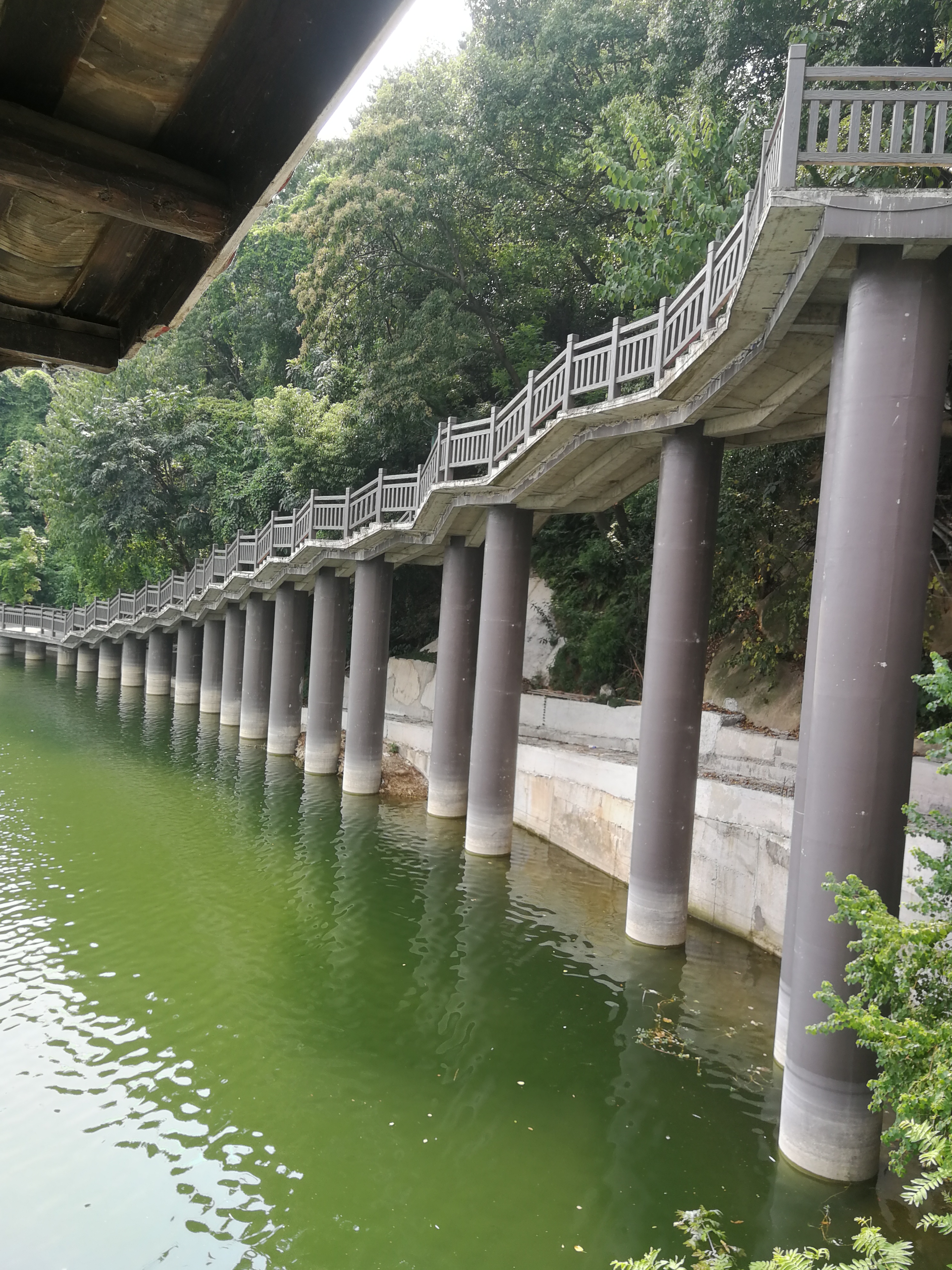 湖边有小路通往桥头,整个岸边的护栏保养完好,都没有坏损。驻足观望,样式独特的风雨桥,出现在青山绿水的美丽风光里,给人一种江南水乡的感觉。望向对岸,无论是山上的电视塔,还是岸边的长长的台阶,都和潇湘阁上看到的感觉相差无几。
