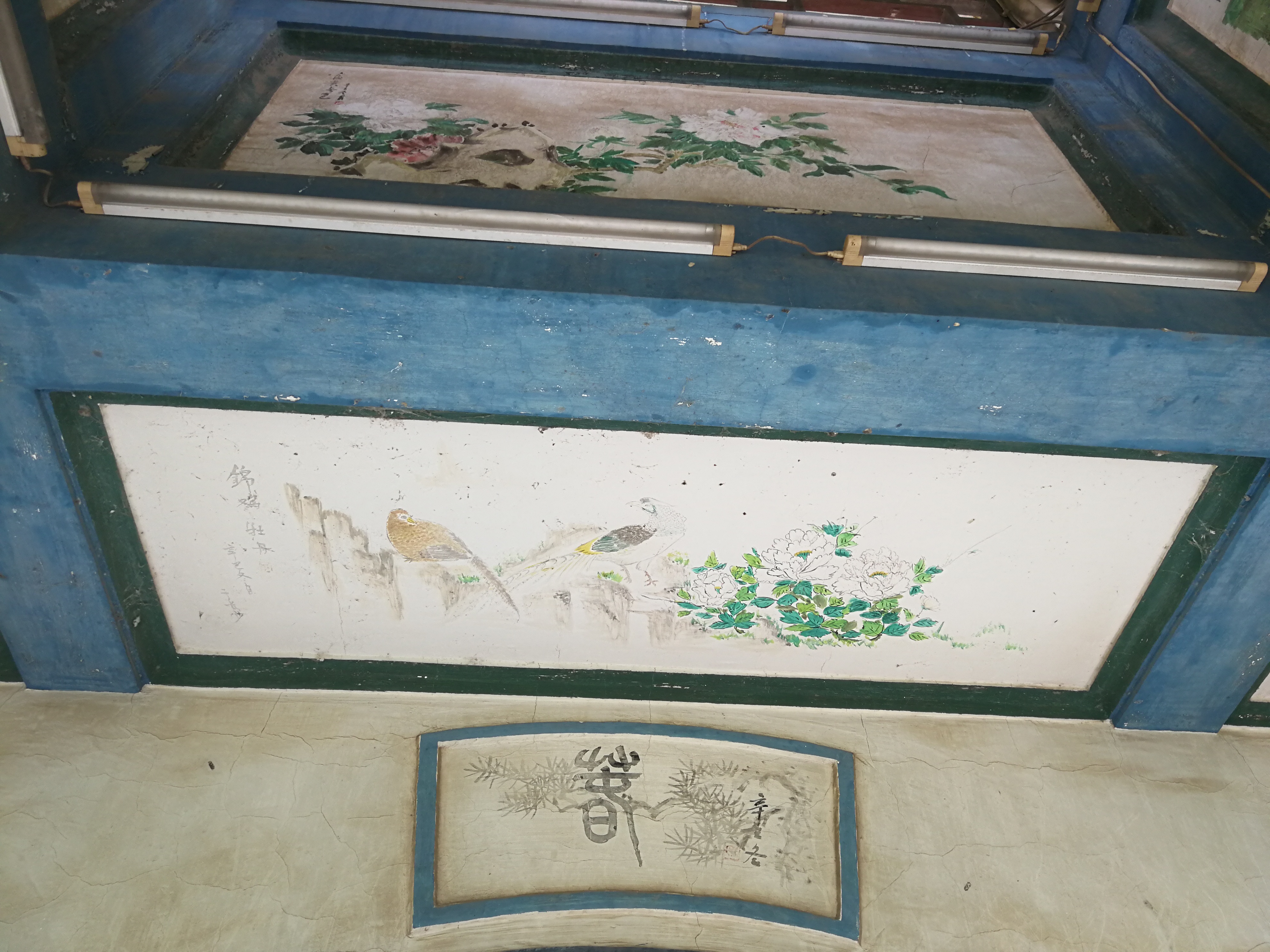 进入亭内,房顶上有水彩勾勒了简单的线条。四个方向分别对应了春夏秋冬。根据季节用工笔画的手法描绘了不同的景色。春天的主题是锦鸡牡丹,迎来了牡丹花的花盛开和鸟语花香。夏天的主题是鸳鸯戏水。池塘里,蛙鸣鱼戏,圣洁的荷花绽放,还有鸳鸯戏水。秋天的主题是金鸡啄菊,生动地描绘了盛开的菊花,以及虎视眈眈的大公鸡。冬天的主题是白鹤寒松,仿佛是仙气飘飘的得道高人一般。