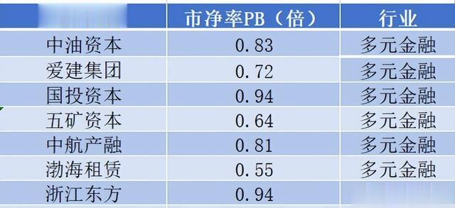 3、多元金融破净股:目前多元金融破净股还有7只,市净率最低只有0.55倍,最高0.94倍。