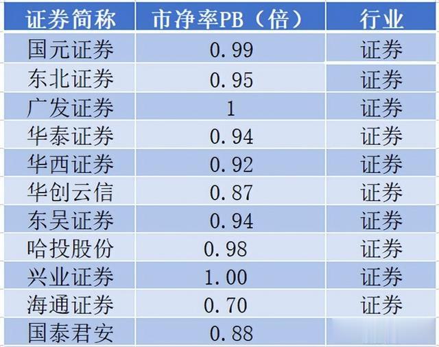 2、破净券商股:目前A股有50只券商股票,经过一周上涨后,市净率等于或小于1的还有11只。