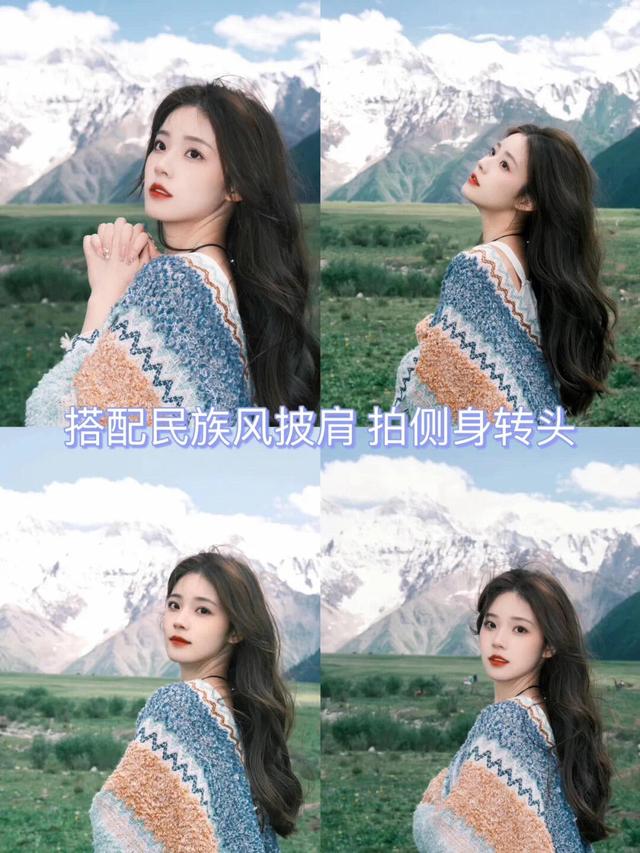 爬山登顶,披肩也是常备的装备,让模特披上一条色彩鲜艳的民族风披肩,然后侧身站立,回眸看向镜头,这样的姿势,能为人像增添一股异域风情,同时也能营造一份神秘感,值得一试。