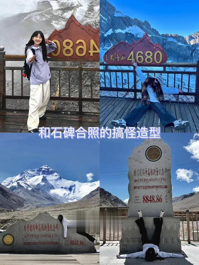 不管是登山途中还是在山顶,总会遇到一些具有标志性的石碑或是路标,这种时候,可以大胆发挥下创意,做出一些搞怪、有趣的动作,比如摊坐张开双臂,躺在石碑上或是做出夸张的表情,出片不仅生动有趣,还能传递一种欢快的氛围,让人感受到旅途中的快乐。