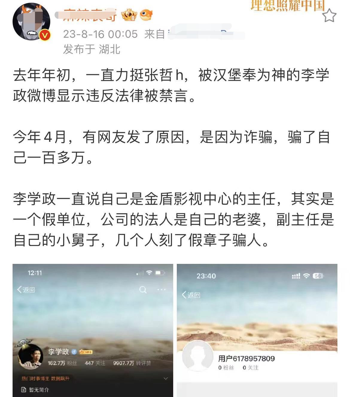 8月16日,知名红V媒体晒出了一则瓜,称知名制片人、演员李学政账号已正式被平台封闭,他本人也因涉嫌诈骗遭到了网友举报和单位的辞退。这一风波引起了网友关注。
