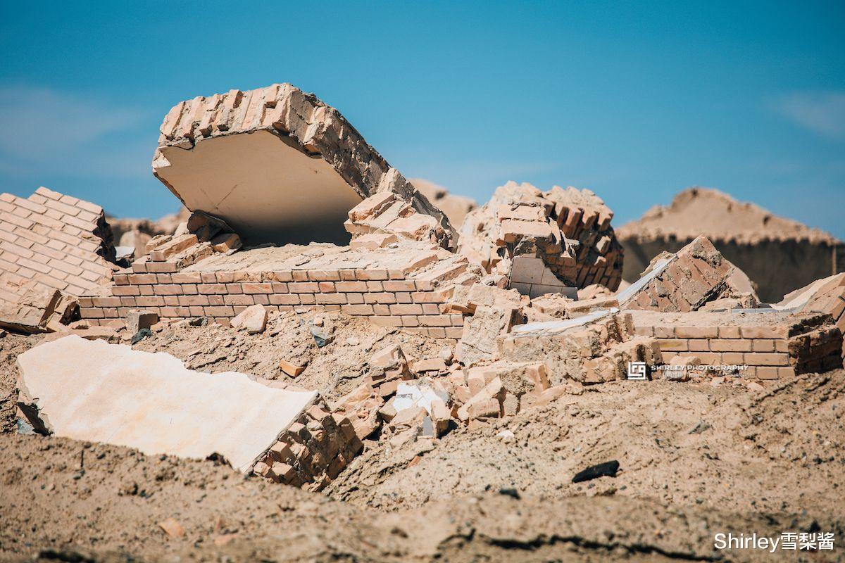 小镇不小,单靠双脚很难将其走遍。繁华落幕后的大片残垣,与远处被积雪覆盖的阿尔金山,带来了强烈的视觉冲击。纵使车开一段,人下车在周围走一圈,仍然没发现一栋完整的房子,一面完好的墙壁,不少房屋已半埋在黄沙之中……角落深处偶尔看到一只鞋,一个玻璃瓶,跨越30多年残存的生活痕迹更是让人浮想联翩。