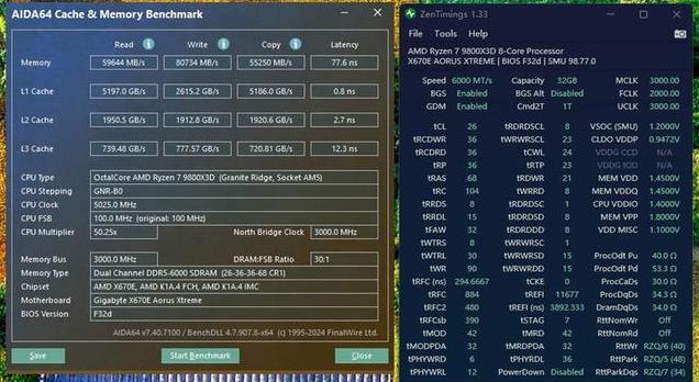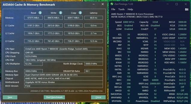 我们给雷克沙ARES RGB DDR5-6000 C26内存套装搭配AMD锐龙7 9800X3D、RTX 4090显卡、技嘉X670E AORUS XTREME主板进行测试,首先是内存的默认设置。
