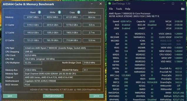 这时可以看到内存的工作频率已经被提升到6200MHz,此时内存的读取、写入、拷贝和延迟分别是67097MB/s、90552 MB/s、61125 MB/s和68.4ns。