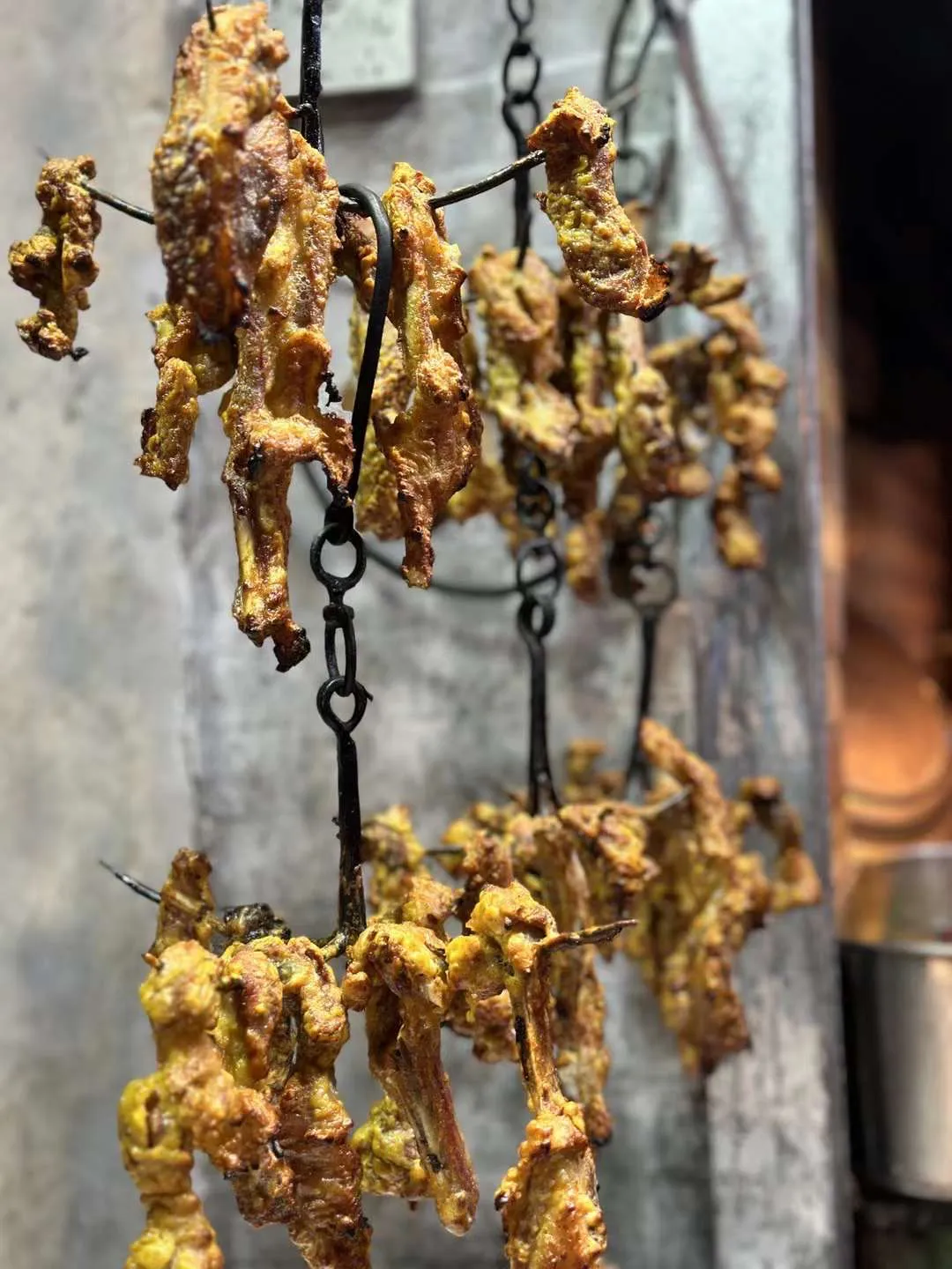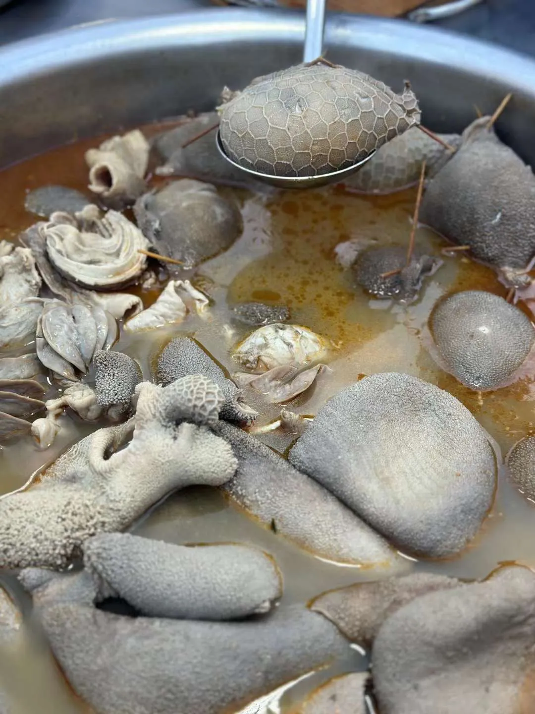 路边摊的羊肚10元一份,我买了一份,里面包的啥具体我不知道,浇上汁吃起来酸酸辣辣,不过我不太爱吃里面包的东西,羊肚还可以。还有一种金黄色的果子,当地人说是烤木瓜。我买了个小份5元,吃起来甜甜的,像腌制的。