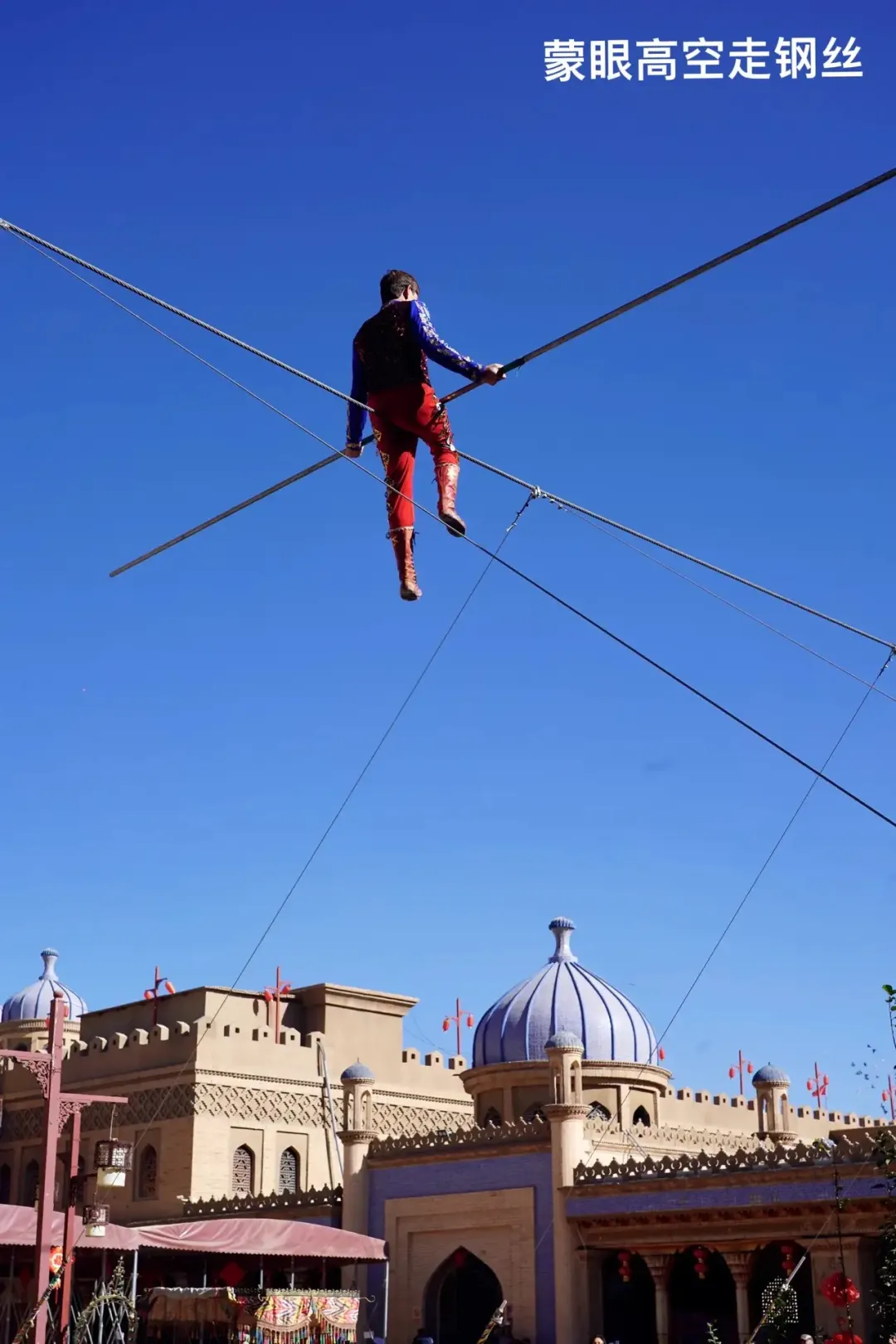 每天中午12点和下午5点半有演出,歌舞表演,十二木卡姆演奏。一点半有走钢丝表演,演员高空蒙眼走钢丝,非常精彩,看得人捏了把汗。