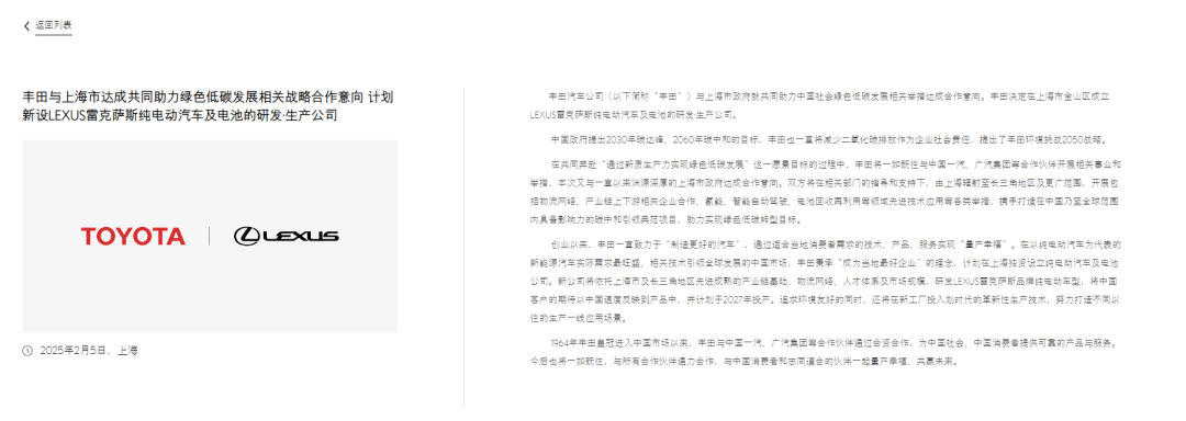 2月5日,雷克萨斯(下文:“LEXUS”与“凌志”同义)官网发布一则消息:丰田汽车公司与上海市政府就共同助力中国社会绿色低碳发展相关举措达成合作意向。丰田决定在上海市金山区成立LEXUS雷克萨斯纯电动汽车及电池的研发·生产公司(下称:新公司),并计划于2027年投产。这一决策标志着雷克萨斯从“进口电动化试水”迈向“中国本土化决战”。