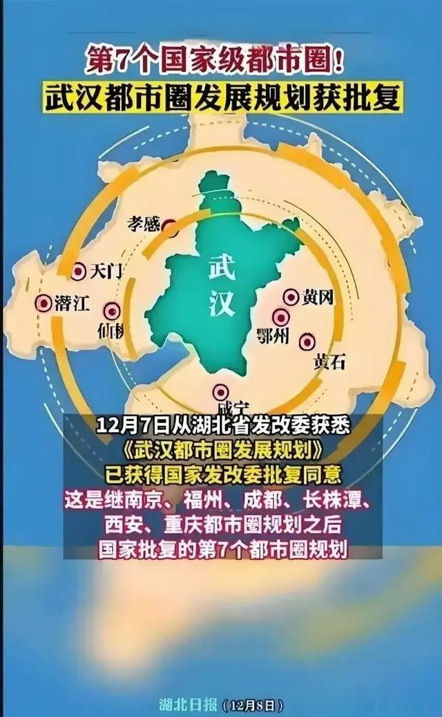 2022年年底,国家发改委正式批准武汉都市圈规划,这成为中国第七个正式获得国家层面批准的都市圈规划,意义重大。而武汉则位于武汉都市圈的核心位置,是武汉都市圈的“带头大哥”,国家也希望武汉能够肩负起带动武汉都市圈全面崛起的重任。