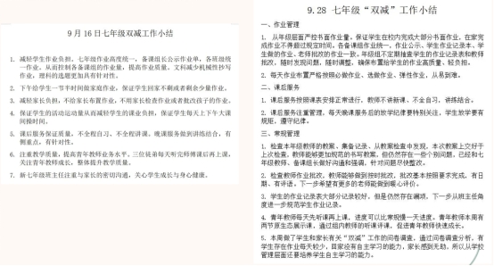 一是每天年部自查。各年部的“双减”工作实行年部负责制,年部主任为本年部的第一责任人,自查问题,自行整改。如问卷调查、督导准备、督查迎检等。