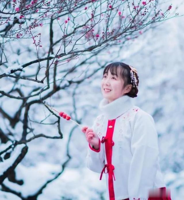 梅花巧施浓妆,大雪中胭红点点,光彩照人,如美人满面含羞。她含情脉脉地执守在西边的路口,好像是有所期待。满天的大雪仿佛女子的罗纱乱舞,又仿佛给梅花姑娘的额头簪满了晶莹的乱玉,梅花在梦里情吻着春风,心中该有多少柔情蜜意啊!