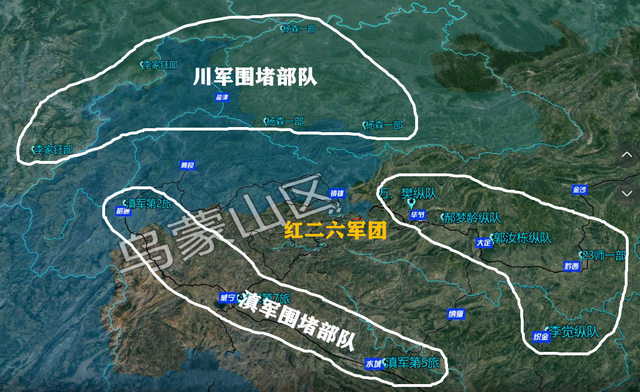一、西北方向那一坨,是由川军杨森部和李家钰部组成的前堵部队。这一路我们在百丈关战役那一节详细介绍过,他们差不多快被四方面军打残了,此刻是有心无力,疲于应付。