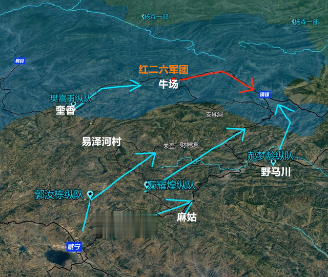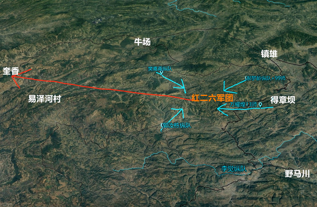 五、二次回旋、得章坝伏击战易泽河战斗,我军虽然小胜一场,但也暴露了位置。于是,贺老总决定重回奎香,然后在转向东北方向的牛场,摆出一副要转进乌蒙山,继续和老蒋玩捉迷藏的态势。如下图
