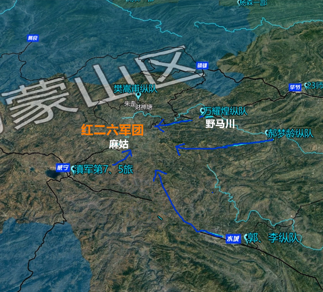 可在赶到麻姑地区后,结果也不尽如人意。不仅郭汝栋和李觉围了上来,而且滇军防守威宁的部队也封锁住南下的道路。如下图
