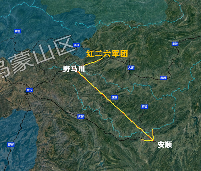 而要想成功到达安顺,走直线是行不通的,应该先向西过了野马川,然后折向东南,才能在敌人的缝隙中穿插前进。如下图