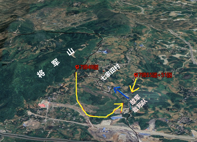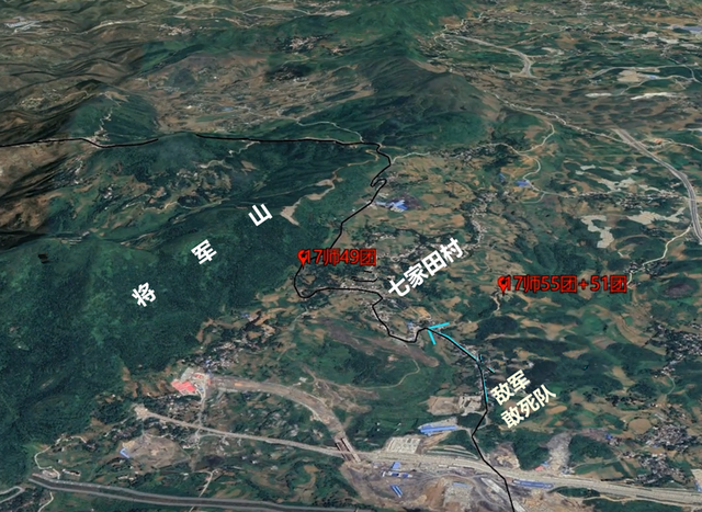 2月19日上午,肖克率红17师进至将军山和七家田村一带,他们刚上公路,就发现一股敌人由大定沿公路接近七家田村。如下图