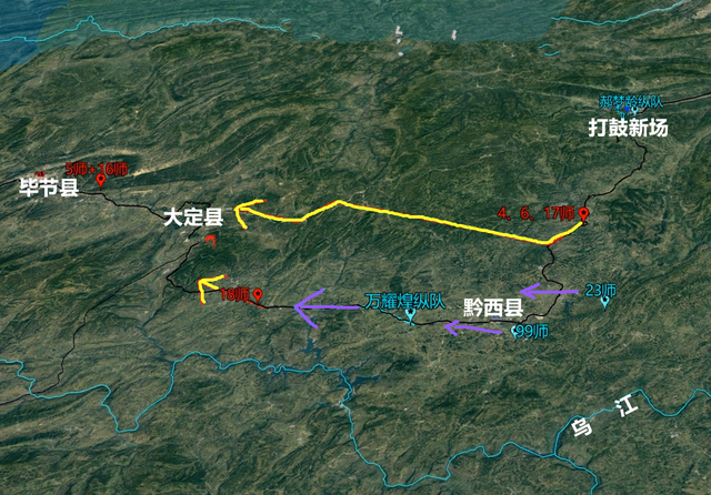 战局瞬间恶化,红18师被迫向大定县方向转移,而万耀煌和此刻已经过了乌江的23师99师也奔着大定县攻击而来。如下图