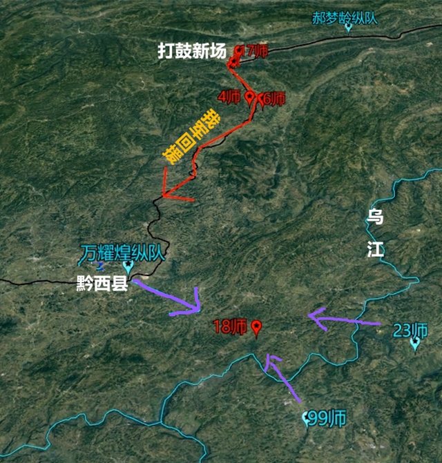 果然,万耀煌没费多大劲,就拿下了黔西县,紧跟着就奔红18师来了。红18师虽然英勇抗击,但身后乌江对岸的国军23师和99师也趁机过江,对红18师形成合围态势。如下图