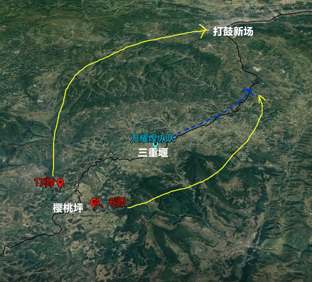 我军判断,万耀煌可能会沿着上图那条公路向黔西前进。于是,萧克率领红17师,贺老总亲率红6师和红4师,一共两路人马在三重堰通往黔西的樱桃坪埋伏起来。