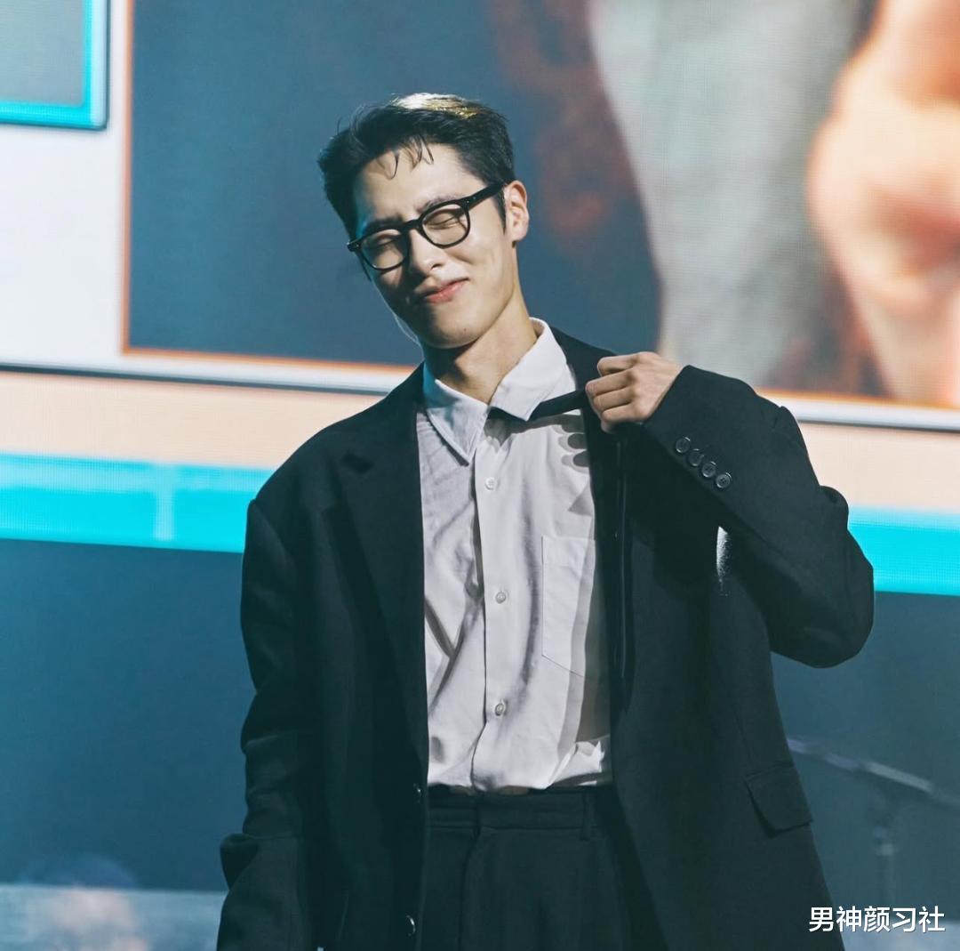 当然他在穿西装的时候也有特别休闲的。他用了宽大的西装来搭配浅色系的衬衫,就显得整个人比较温柔,看上去也是男子力爆棚的。戴上一副黑框眼镜,就能够打造出知识分子的感觉了。
