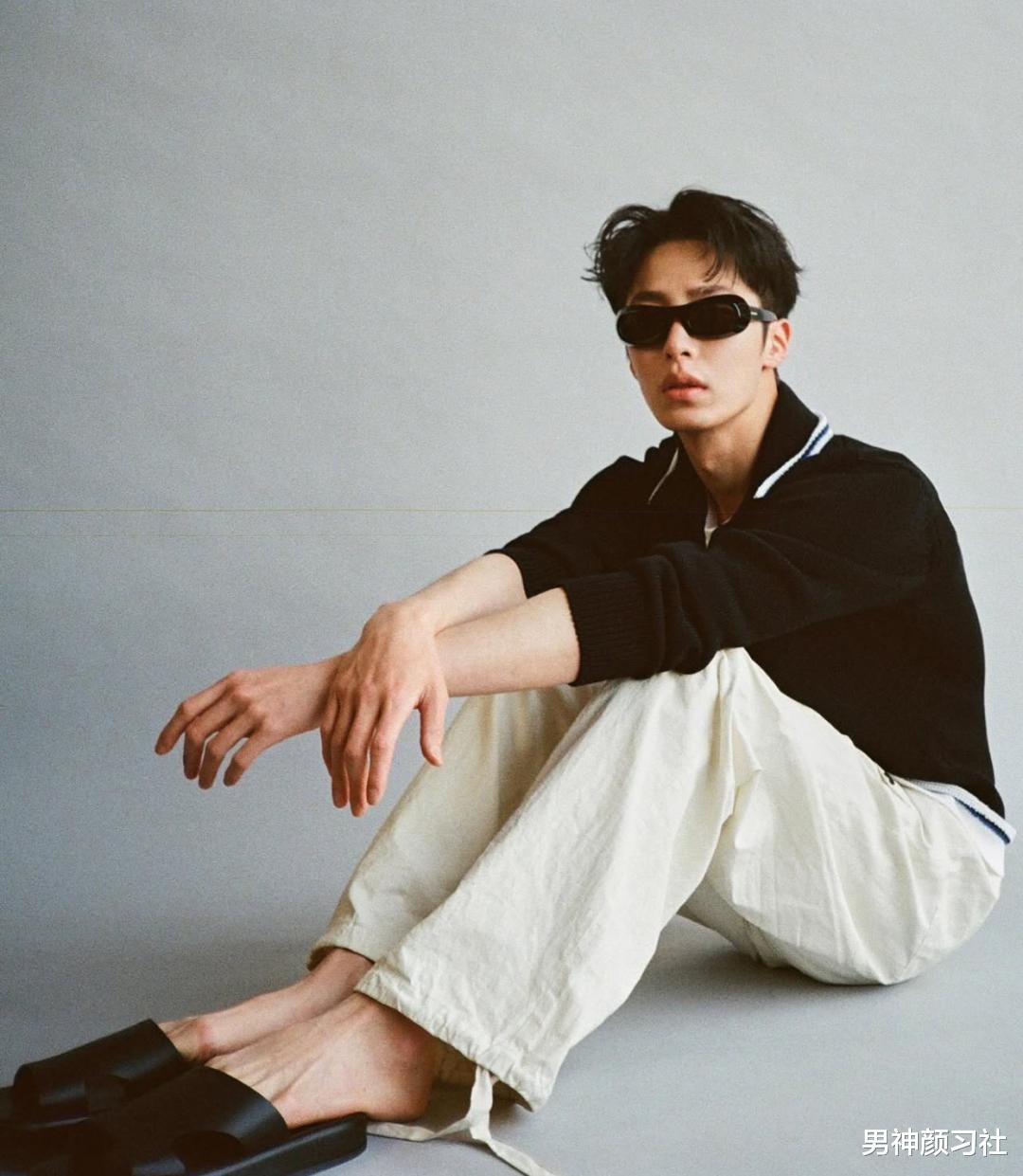 这套其实也非常好看,像这种polo领的卫衣,这两年真的是非常流行。他的做法是搭配白色裤子,再加上一双拖鞋,就营造出了那种比较贵气的公子哥的形象。