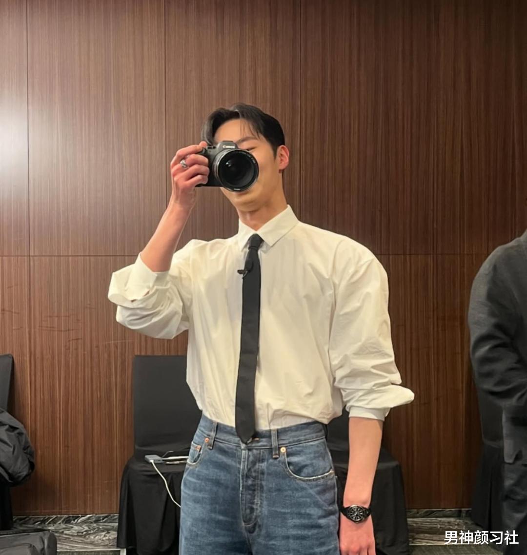 这一身也是他习惯的双排扣收腰西装,对于身材不是特别瘦削的男生来说,适当凸显出一些腰身反而能让你看上去更加显瘦一些。想要再增加一点正式感的,就可以像他这样穿上一件白衬衫和领带。