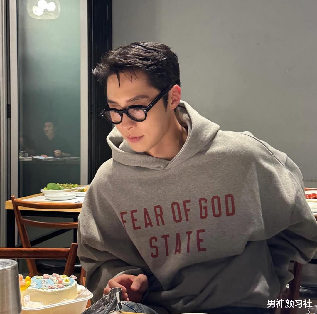 他在穿这种基础款卫衣的时候,也是会戴上一副黑框眼镜的,这样的话整个人看着就比较有气质。所以大家穿卫衣想要显得不那么运动风的话,就可以看看他这种路线。只要增加一个小道具,你全身的风格就能完全不一样。
