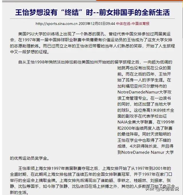 信息来源:中国体育报:《王怡梦想没有“终结”时--前女排国手的全新生活》发布时间:2003年12月3日