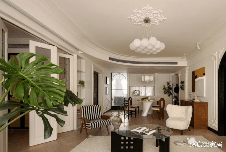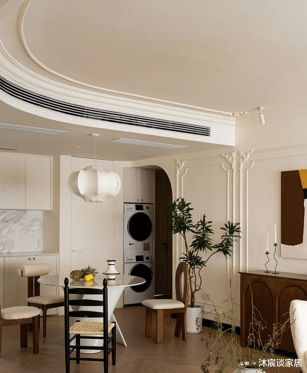 设计师再利用弧形元素穿插在动态空间里,在法式设计中,弧形很常见,它具备空间引导性,将顶面、墙面和圆桌完美起来呼应,让整个区域变得更为灵动,进门后眼睛就挪不开了。