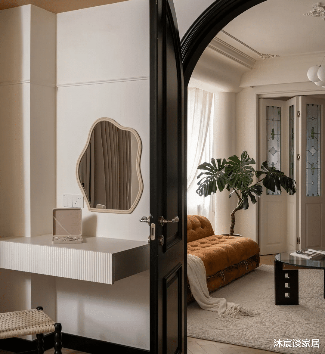 充满仪式感的主卧室书房的对面是主卧室,一扇黑色对开的拱形门极具仪式感,推开这扇门进入主卧空间。