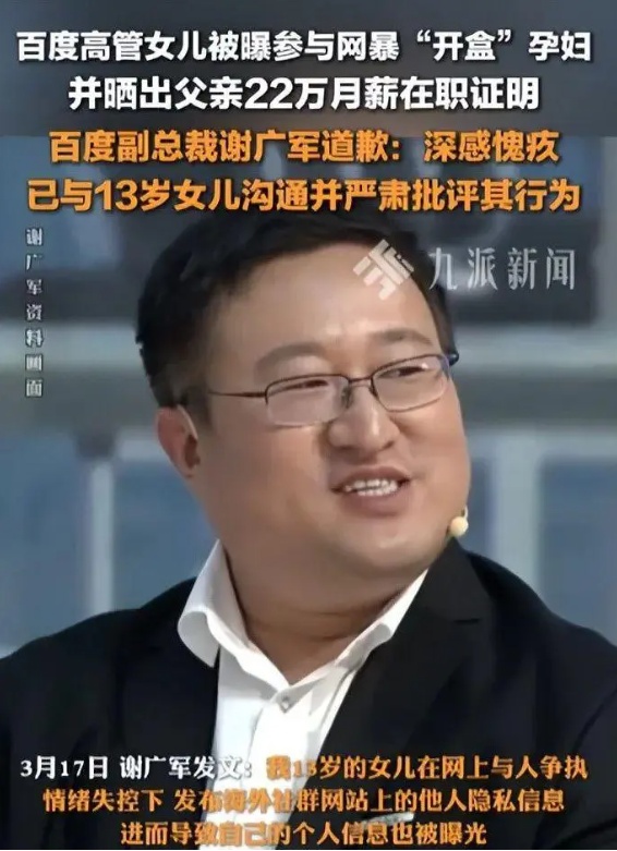 2. 谢广军的“爹味道歉”女儿用海外账号“开盒”孕妇信息(即通过黑客手段获取并曝光他人隐私),晒出父亲22万月薪证明。而谢广军的朋友圈道歉声明被网友痛批“三宗罪”: