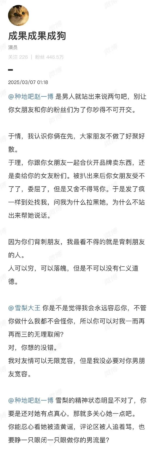 前天晚上,《爱情公寓5》中诸葛大力的扮演者成果突然在微博上发文,揭露了《种地吧》十个勤天之一的赵一博和网红雪梨大王之间的恋爱关系。