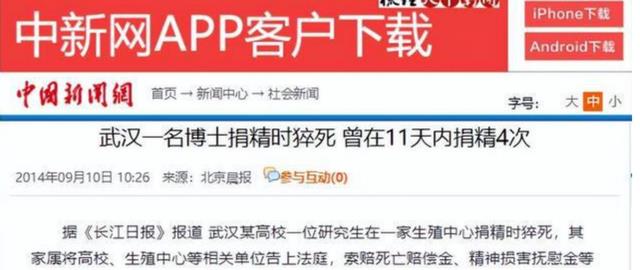 2.《华科在读医学博士校内捐精猝死其父索赔400万》2012-6-20《长江商报》