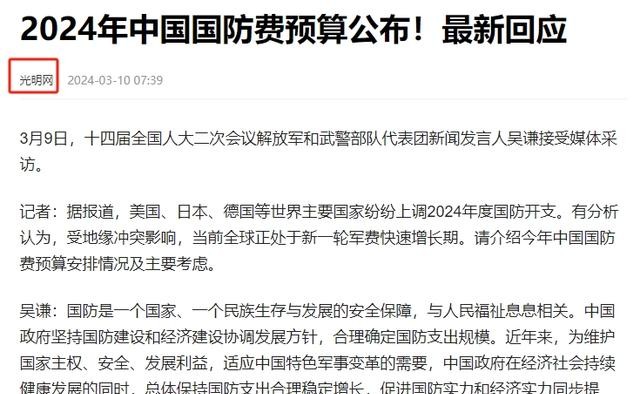 信源:光明网 2024年3月10日关于“2024年中国国防费预算公布!最新回应”的报道